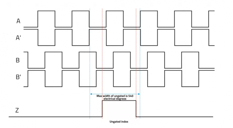 索引脉冲(也称为 Z 通道脉冲)相对于 A 通道和 B 通道的宽度可以在 360 电角度到 90 电角度之间变化。索引脉冲的宽度*不能超过 A 通道或 B 通道脉冲的两个上升沿。